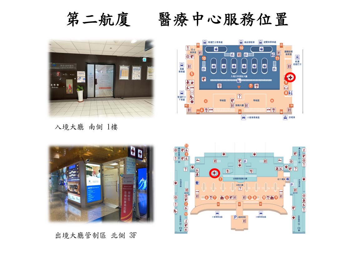 機場醫療中心位置為桃園機場公司指定設置,共有四處服務位置: